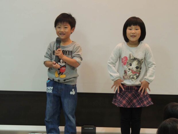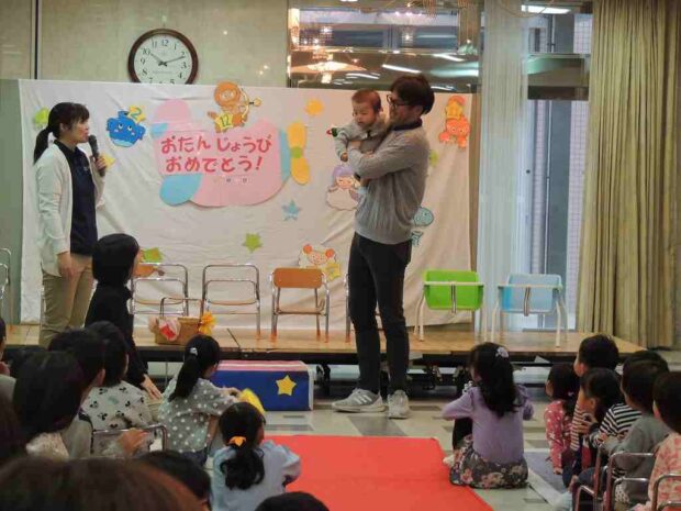 今週は12月の誕生会でした 年内最後の誕生会 12月生まれのお友だちが舞台に並びます みんなの前に出るのは、少しドキドキしますね 幼児クラスになると、自分で自己紹介をします 「お名前は?何歳に…