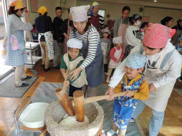 12月8日に もちつき大会 を行いました まずは、蒸したもち米をお家の方に 潰して頂きます なかなか力のいる作業です つく時もお父さんにがんばってもらいました お友だちもお母さんと一緒につきましたよ &nb…