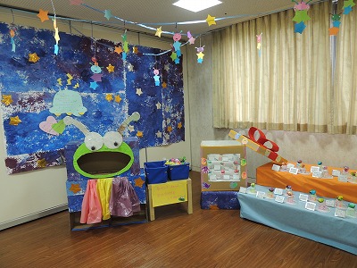 各クラスで個人作品や共同作品を作ったものを 展示しました。 どのクラスも年齢に応じた素敵な作品になりました。 テーマは 『宇宙からの贈りもの』です!! ぜひご覧ください。 &…