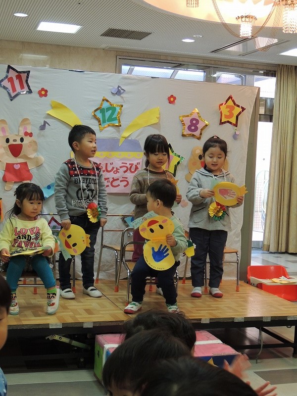 3月生まれのお友だちは毎年自分の誕生会はまだかなぁまだかなぁと待ちわびています 待ちわびた誕生会 大きな声で自己紹介をしていましたよ 今月は天河草子のおじいちゃん・おばあちゃんも一緒にお祝い 元気なおじいちゃん達に子ども…