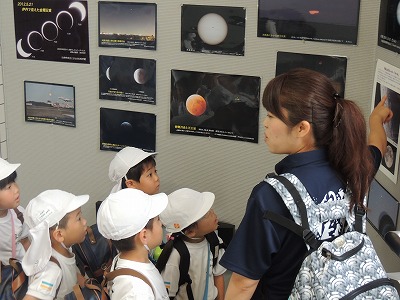 7月5日、いるか・きりん・はくちょう組は 伊丹市立こども文化科学館にプラネタリウム遠足へ行きました 科学館のいたるところには、星座や惑星についての展示がたくさんあり、子どもたちは興味津々 一枚ごとにじ~~っ…