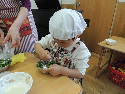 先日、きりん組になってはじめてのクッキングをしました みんなでエプロンをつけて、帽子をかぶり、準備は万端!! 今日はきゅうりの甘酢和えを作るぞ~~ 初めに、砂糖で軽量の仕方を練習しました 計量スプーン同士を…