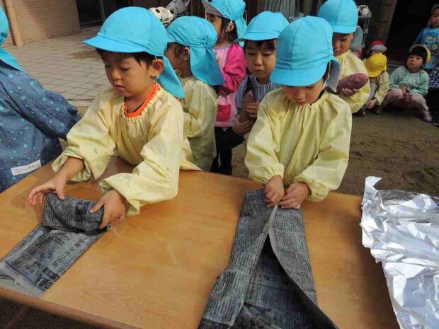 11月14日はやきいも大会でした まずはおいもを濡らした新聞紙でぐるぐると巻きます。 包み方も教わり上手に巻いていました! 利用者様とも協力して巻いています その間、うさぎぐみ・くじらぐみのみ…