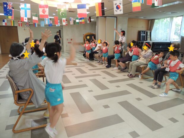 はくちょう組と天河草子の方々で合同運動会をしました 天河草子からは多くの方に参加頂けたので、前後半の2部制で行います。 1部はケアハウス・ヴィラ櫟・玻璃の方々です まずは準備体操~ 応援に駆けつけたこいぬ組…
